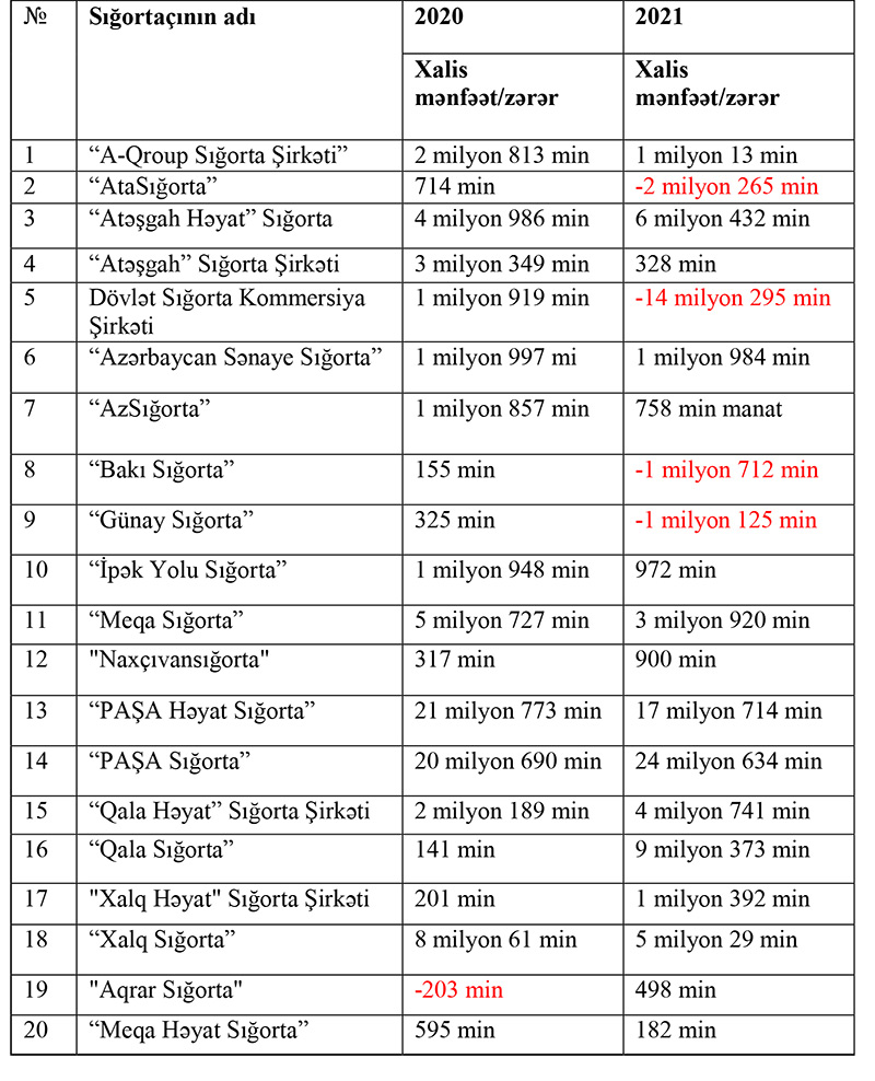 Marja.az-ın araşdırmasına görə, 2021-ci ili 20 şirkətdən 16-sı xalis mənfəətlə, 4-ü xalis zərər ilə başa vurub.