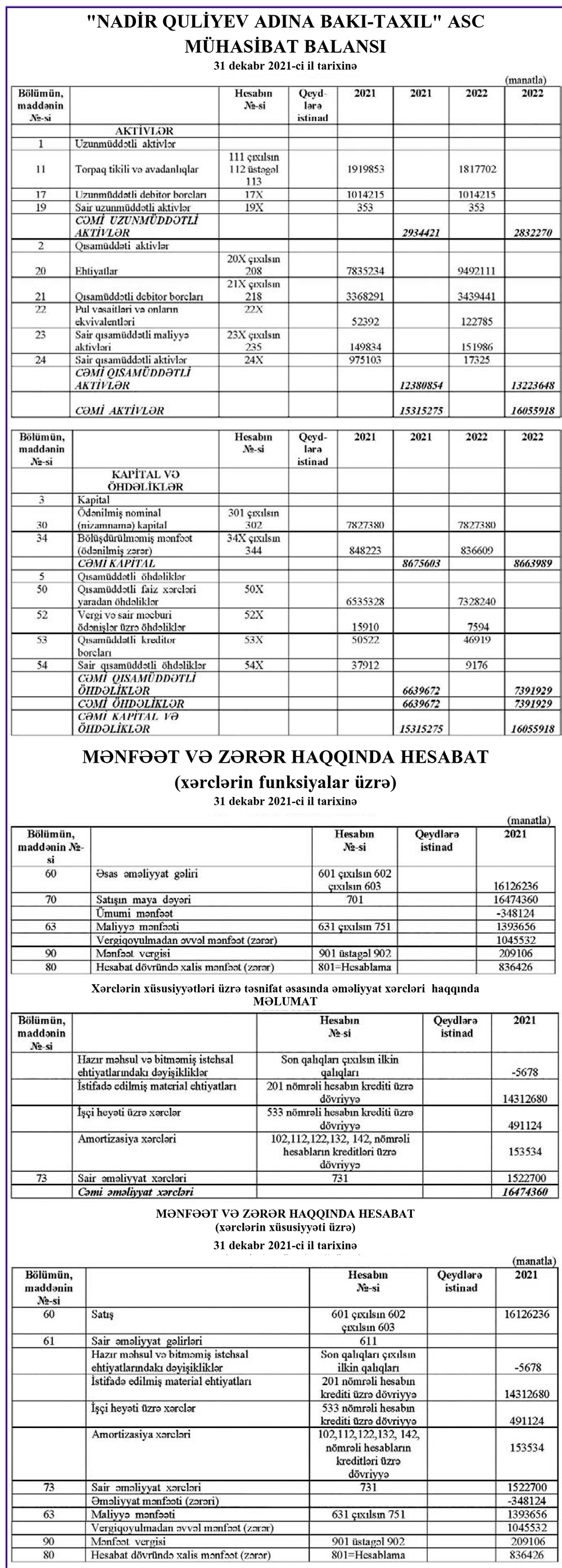 “Nadir Quliyev adına Bakı-Taxıl” ASC 2021-ci ili 836 min manat xalis mənfəət ilə başa vurub.