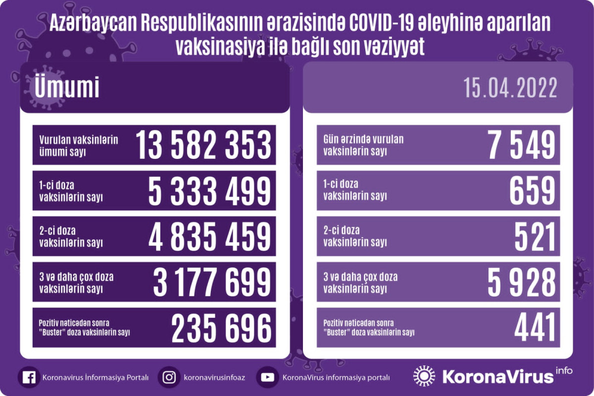 Azərbaycanda son sutkada koronavirus (COVID-19) əleyhinə 7549 vaksin vurulub. Bir gündə birinci mərhələ üzrə vaksinasiya olunanların sayı 659, ikinci mərhələ üzrə vaksinasiya olunanların sayı 521, üç və daha çox doza vaksin vurduranların sayı 5928, pozitiv nəticədən sonra buster doza üzrə vaksinasiya olunanların sayı isə 441 nəfərdir.