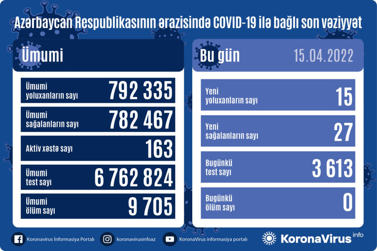 Azərbaycanda koronavirus (COVID-19) infeksiyasına 15 yeni yoluxma faktı qeydə alınıb, 27 nəfər müalicə olunaraq sağalıb.