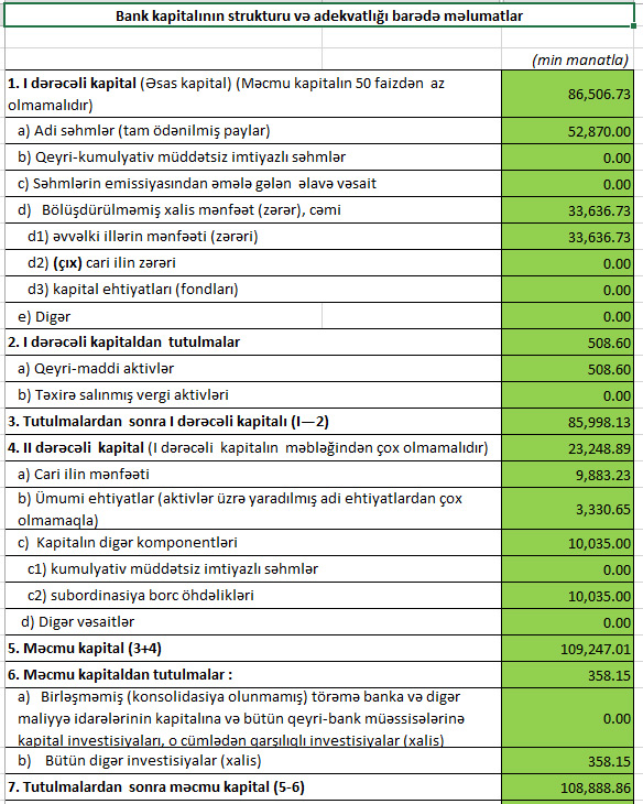 Xatırladaq ki, 2021-ci ilin 1-ci rübündə “Bank of Baku”nun cəmi əməliyyat gəlirləri 17 milyon 359 min manat, cəmi əməliyyat xərcləri 13 milyon 174 min manat, əməliyyat mənfəəti 4 milyon 185 min manat təşkil etmişdi. Ehtiyatdan azad olmuş 715 min manat mənfəətə əlavə edilmiş və Bank 4 milyon 900 min manat mənfəətindən 790 min manat mənfəət vergisi ödəmişdi.