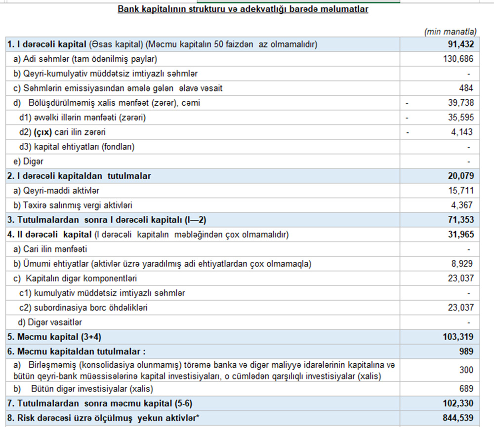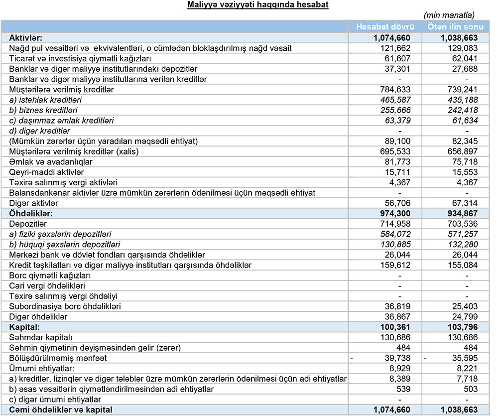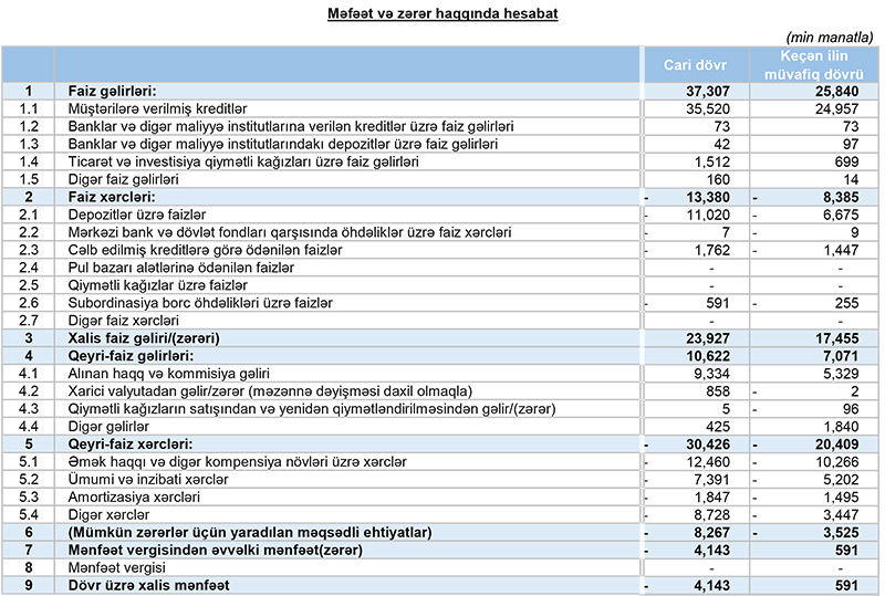 Bankın yaydığı press-relizdə bildirilir ki, 31 mart 2022-ci il tarixinə Bankın əməliyyat mənfəəti 3,7 milyon manat təşkil edib. Rüb ərzində qazanılmış faiz gəlirləri 37 milyon manatı ötüb, qeyri-faiz gəlirləri isə 11 milyon manata çatıb. Bununla da Bankın qeyri-faiz gəlirləri ötən ilin uyğun dövrü ilə müqayisədə 50%, faiz gəlirləri isə 44% artıb.