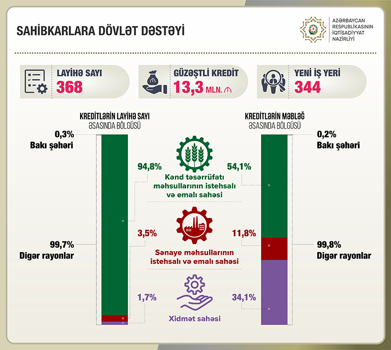 Bu ilin əvvəlindən sahibkarlara dövlət dəstəyi çərçivəsində 368 layihənin maliyyələşdirilməsinə 13,3 milyon manat güzəştli kredit verilib.