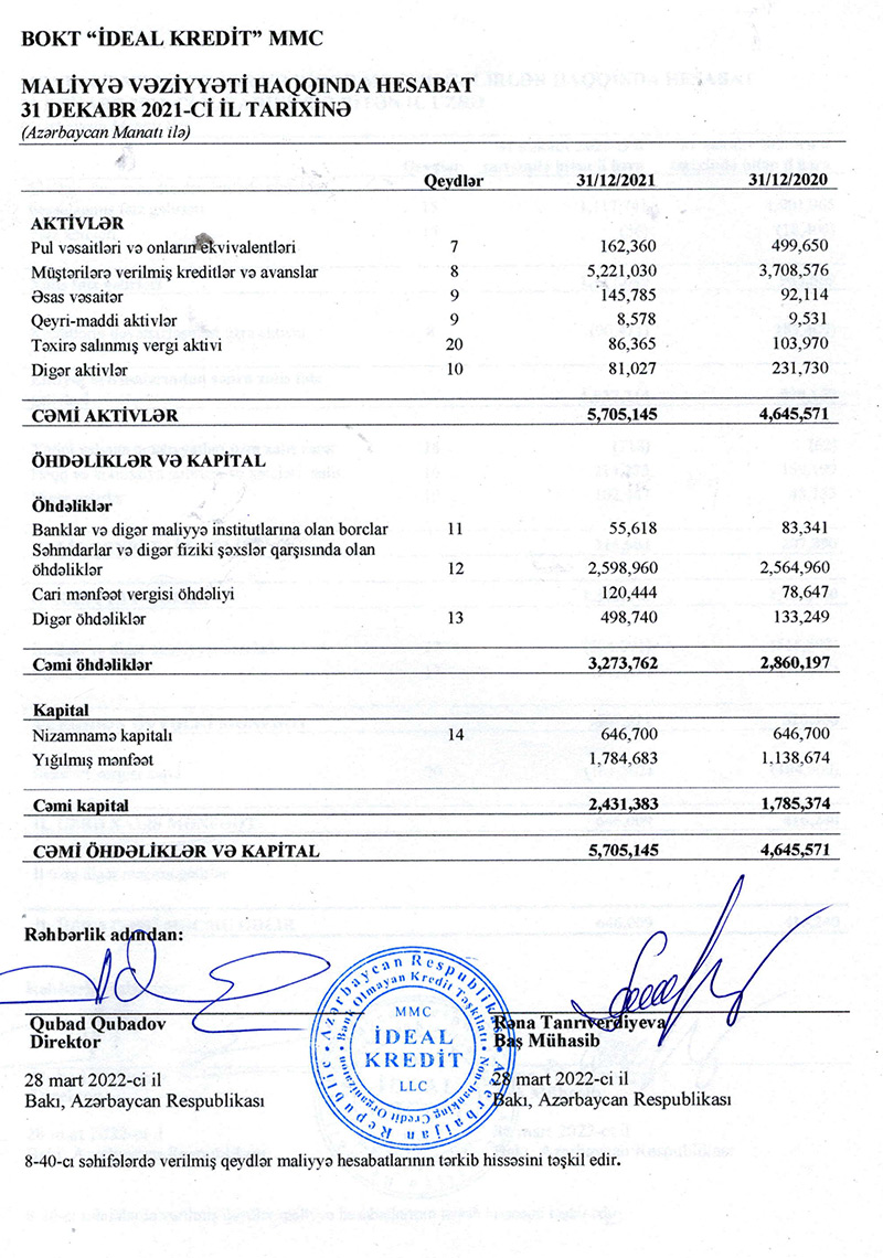 2020-ci ilin sonu ilə müqayisədə "İdeal Kredit"in kredit portfeli (müştərilərə verilmiş kreditlər) 1 milyon 513 min manat və ya 41% artaraq 5 milyon 221 min manata yüksəlib.