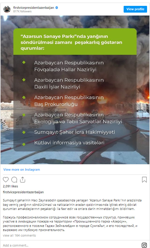 “Sumqayıt şəhərinin Hacı Zeynalabdin qəsəbəsində yerləşən “Azərsun Sənaye Parkı”nın ərazisində baş vermiş yanğının söndürülməsi və nəticələrinin aradan qaldırılmasında iştirak etmiş dövlət qurumları əməkdaşlarının peşəkarlığı ilə fəxr edir və onlara dərin minnətdarlığımı bildirirəm”.