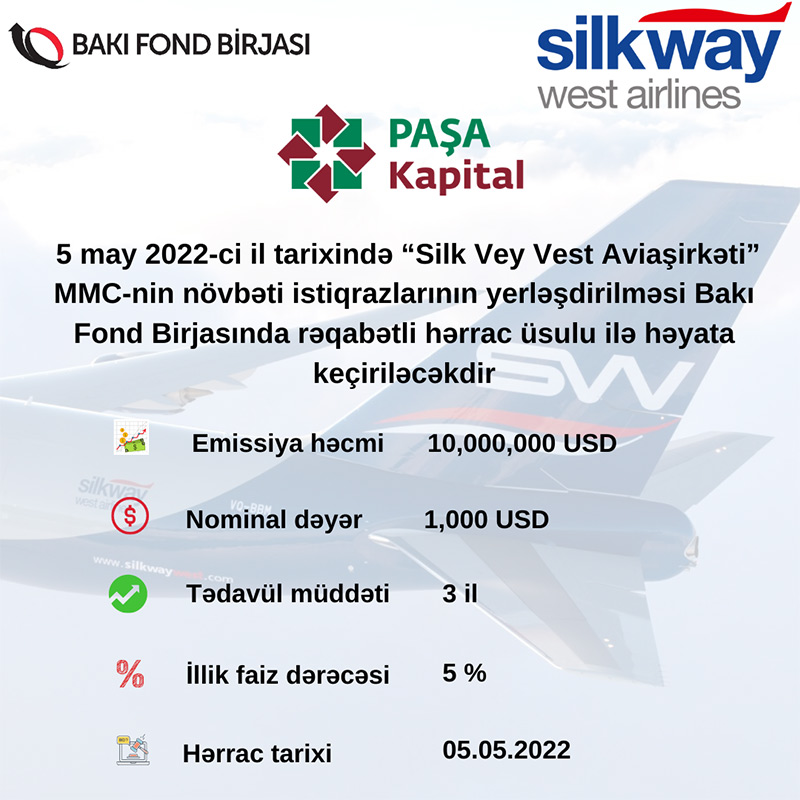 Birjanın yaydığı məlumatda bildirilir ki, 5 may 2022-ci il tarixində “Silk Vey Vest Aviaşirkəti” MMC-nin istiqrazlarının yerləşdirilməsi Bakı Fond Birjasında rəqabətli hərrac üsulu ilə həyata keçiriləcəkdir.