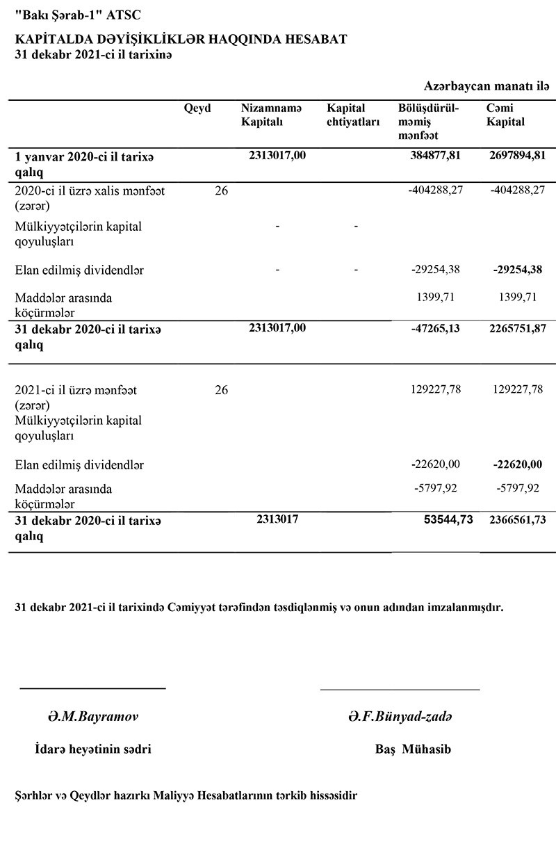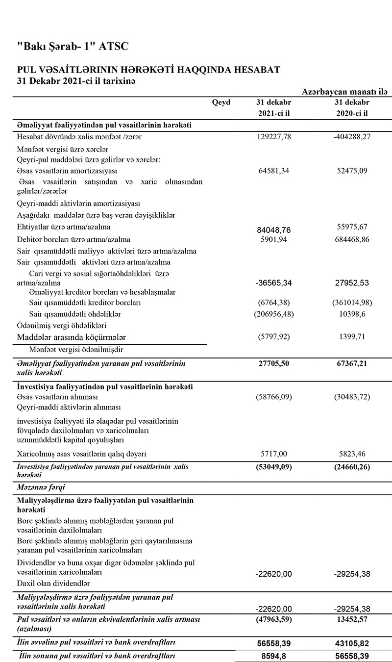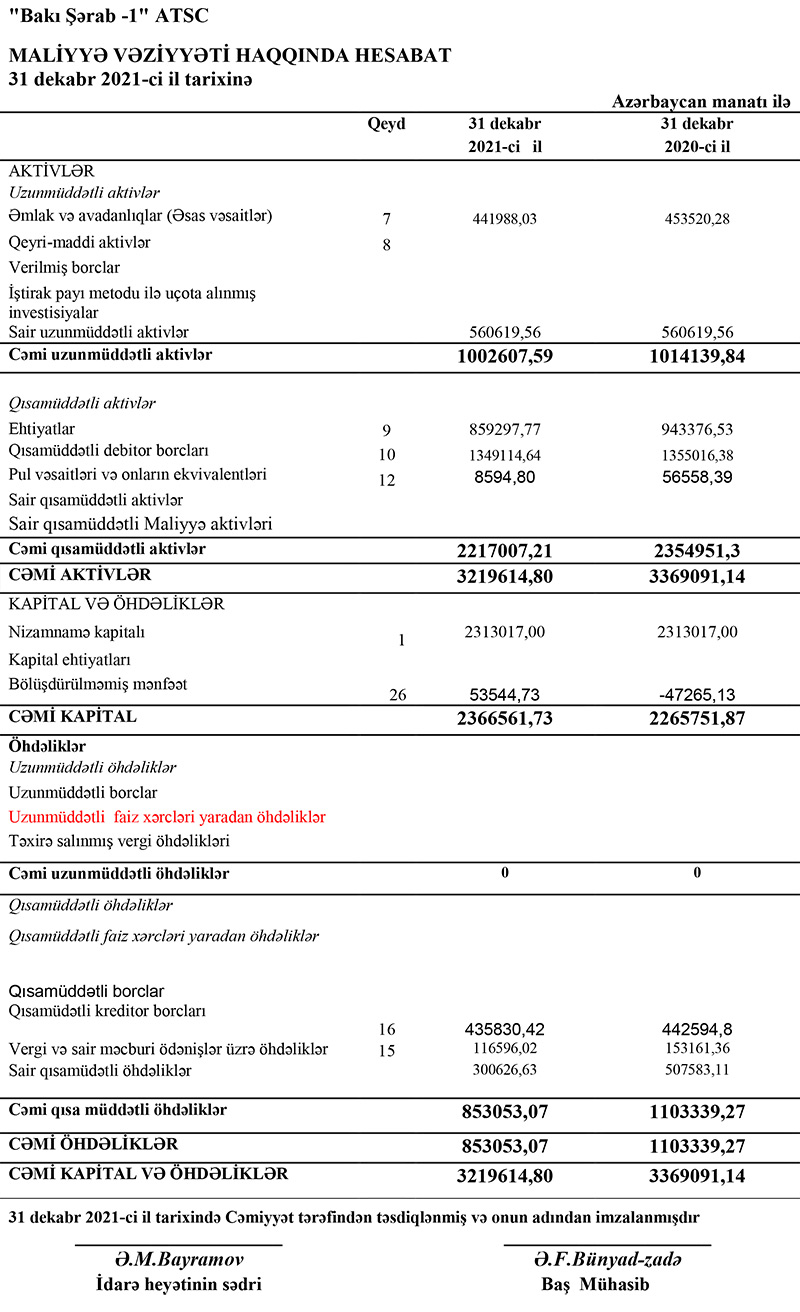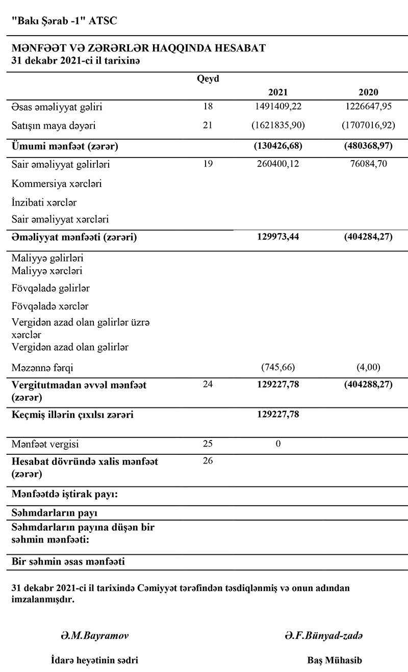 "Bakı Şərab -1" ATSC 2021-ci ili 129 min 973 manat xalis mənfəət ilə başa vurub. Halbuki, şirkət 2020-ci ili 404 min 284 manat xalis zərər ilə bağlamışdı.