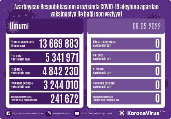 Azərbaycanda son sutkada koronavirus (COVID-19) əleyhinə vaksin vurulmayıb. Vurulan vaksinlərin ümumi sayı 13 669 883, birinci mərhələ üzrə vaksinasiya olunanların ümumi sayı 5 341 971, ikinci mərhələ üzrə vaksinasiya olunanların sayı 4 842 230, üç və daha çox doza üzrə vaksinasiya olunanların sayı 3 244 010, pozitiv nəticədən sonra buster doza üzrə vaksinasiya olunanların sayı isə 241 672 nəfər təşkil edir.