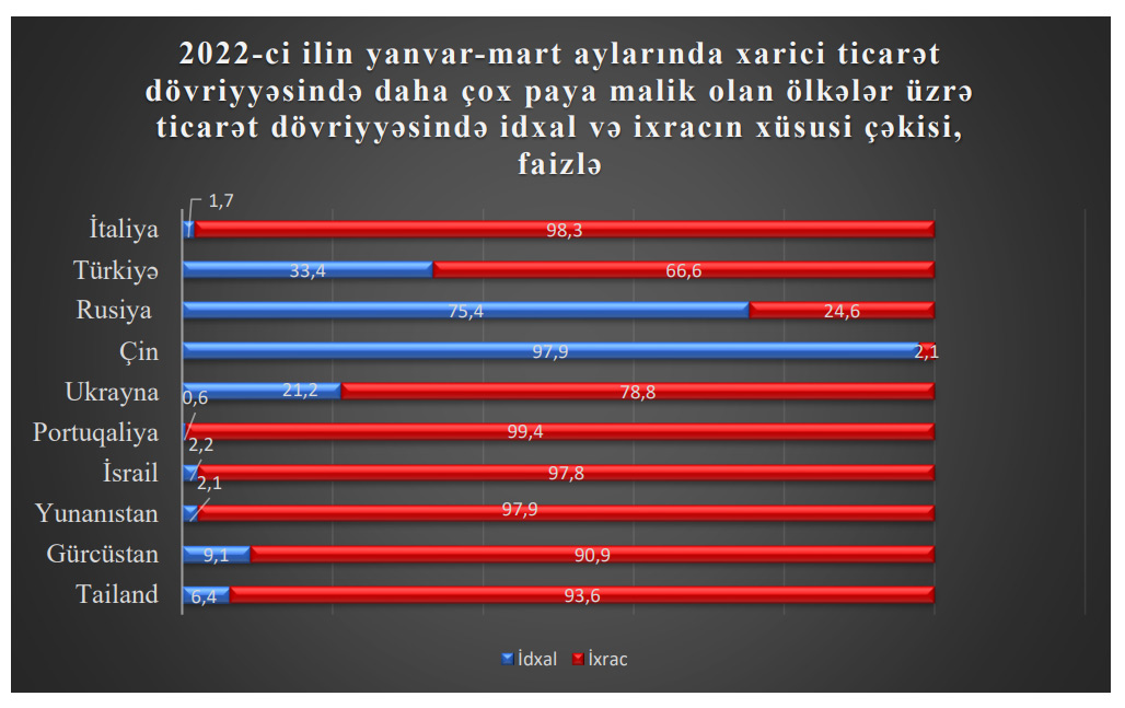 2022-ci ilin yanvar-mart aylarında əvvəlki ilin eyni dövrü ilə müqayisədə mühüm məhsul növlərindən təzə tərəvəz ixracı 50,6 faiz, tütün – 3,4 dəfə, çay – 33,3 faiz, mineral gübrələr – 7,3 dəfə, polietilen – 1,4 faiz, emal olunmamış alüminium – 1,8 dəfə, qara metallardan çubuqlar – 47,4 faiz, sement klinkerləri – 20,9 faiz, qara metallardan borular – 36,8 faiz, bentonit gili – 20,3 faiz artmış, təzə meyvə ixracı isə 6,1 faiz, şəkər – 33,9 faiz, bitki yağları – 38,4 faiz, meyvə və tərəvəz şirələri – 37,3 faiz, meyvə və tərəvəz konservləri – 6,5 faiz, marqarin, qida üçün yararlı digər qarışıqlar – 41,5 faiz, kartof – 45,1 faiz, təbii üzüm şərabları və üzüm suslosu – 56,9 faiz, pambıq lifi – 30,4 faiz, polipropilen – 8,0 faiz, pambıq ipliyi – 21,5 faiz, qara metallardan yarımfabrikatlar – 23,2 faiz azalmışdır. 2021-ci ilin yanvar-mart ayları ilə müqayisədə 2022-ci ilin yanvar-mart aylarında təzə meyvə idxalı 7,4 faiz, kərə yağı, digər süd yağları və pastaları – 19,5 faiz, unlu qənnadı məmulatları – 15,4 faiz, kartof – 7,6 faiz, quş əti və onun əlavə məhsulları – 26,5 faiz, minik avtomobilləri – 12,1 faiz, dərman vasitələri – 16,0 faiz, polad prokatı – 31,5 faiz, qara metallardan çubuqlar – 11,2 faiz, rezin şinlər – 23,1 faiz, sintetik yuyucu vasitələr – 6,3 faiz, polietilen – 1,7 dəfə, mebellər – 2,3 faiz, avtobuslar – 2,3 dəfə, məişət kondisionerləri – 1,8 dəfə, qara metallardan künclüklər – 19,2 faiz, polipropilen – 25,7 faiz, sement – 7,6 faiz artmış, buğda idxalı isə 2,7 faiz, bitki yağları – 14,5 faiz, xam şəkər – 24,8 faiz, şokolad və şokolad məhsulları – 5,8 faiz, çay - 2,6 faiz, təzə tərəvəz – 41,5 faiz, mal əti – 51,4 faiz, siqaretlər – 80,8 faiz, qara metallardan borular – 10,8 faiz, hesablama maşınları, blok və qurğuları – 14,6 faiz, yük avtomobilləri – 19,0 faiz, mineral gübrələr – 79,7 faiz, paltaryuyan maşınlar – 8,5 faiz, məişət soyuducuları – 43,2 faiz azalmışdır.