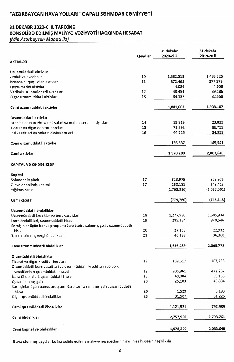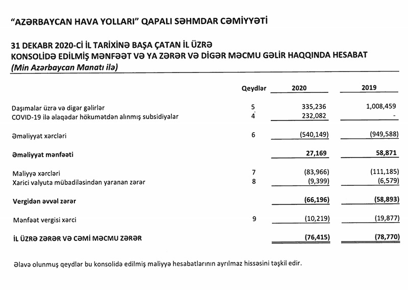“Azərbaycan Hava Yolları” QSC (AZAL) 2020-ci ili 76 milyon 415 min manat xalis zərər ilə başa vurub. Halbuki, AZAL 2019-cu ili 78 milyon 770 min manat xalis zərər ilə bağlamışdı. Beləliklə, 2019-cu illə müqayisədə 2020-ci ildə AZAL-ın xalis zərəri 3% azalıb.