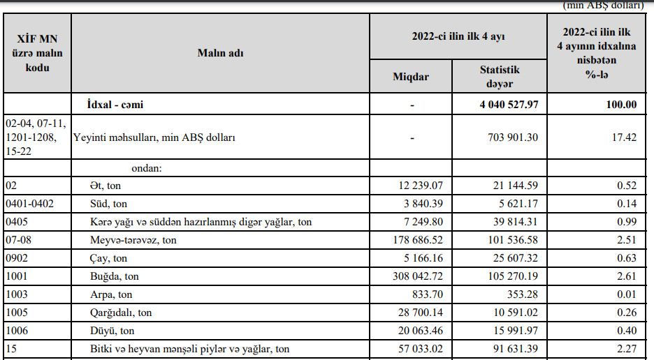 2022-ci ilin ilk 4 ayında (yanvar-aprel) Azərbaycana 703 milyon 901 min dollar dəyərində yeyinti məhsulları idxal edilib.