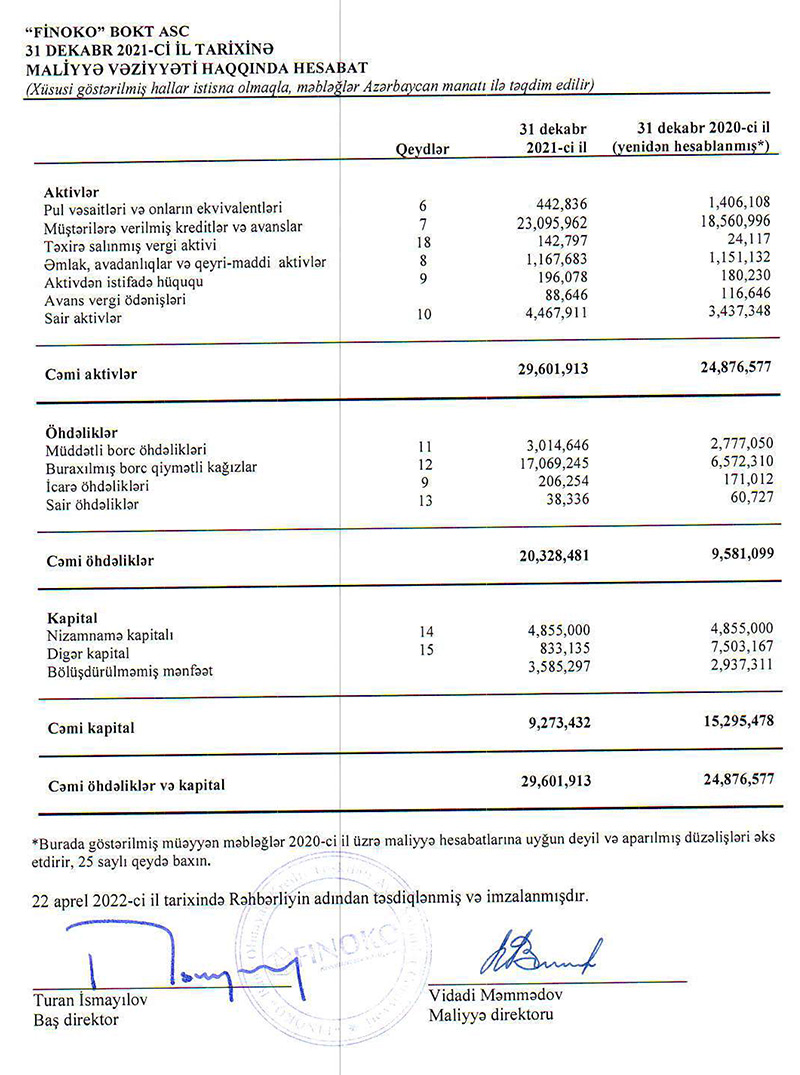 Marja.az xəbər verir ki, "Finoko" BOKT-un faiz gəlirləri 2020-ci ildə 5 milyon 65 min manat ikən, 2021-ci ildə 5 milyon 725 min manat təşkil edib. "Finoko"nun faiz xərcləri isə 2020-ci ildəki 897 min manatdan 2021-ci ildə 2 milyon 86 min manata yüksəlib. Eyni zamanda, ASC ötən il kredit zərərləri üçün ehtiyata 1 milyon 190 min manat ayırıb. Faiz xərclərinin artması və ehtiyata ayırma xalis mənfəətin düşməsinə səbəb olub.