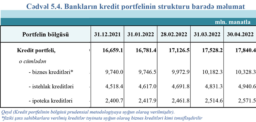 2022-ci ilin aprel ayında bank sektorunun kredit portfeli (müştərilərə verilmiş kreditlər) 312,2 milyon manat artaraq 30 aprel 2022-ci il tarixində 17 milyard 840,4 milyon manata çatıb. Martın sonunda sektorun kredit portfeli 17 milyard 528,2 milyon manat təşkil etmişdi.