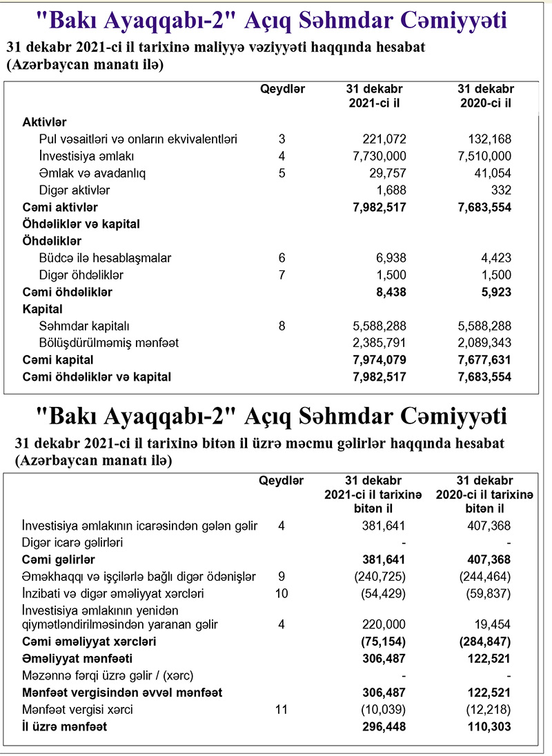"Bakı Ayaqqabı - 2" ayaqqabı istehsalından deyil, əsasən əmlakının icarəsindən gəlir əldə edir."Bakı Ayaqqabı-2" ASC 2021-ci ili 296 min 448 manat xalis mənfəət ilə başa vurub. Halbuki, şirkət 2020-ci ili 110 min 303 manat xalis mənfəət ilə bağlamışdı. Beləliklə, 2020-ci illə müqayisədə 2021-ci ildə "Bakı Ayaqqabı -2"nin xalis mənfəəti 2,7 dəfə artıb.