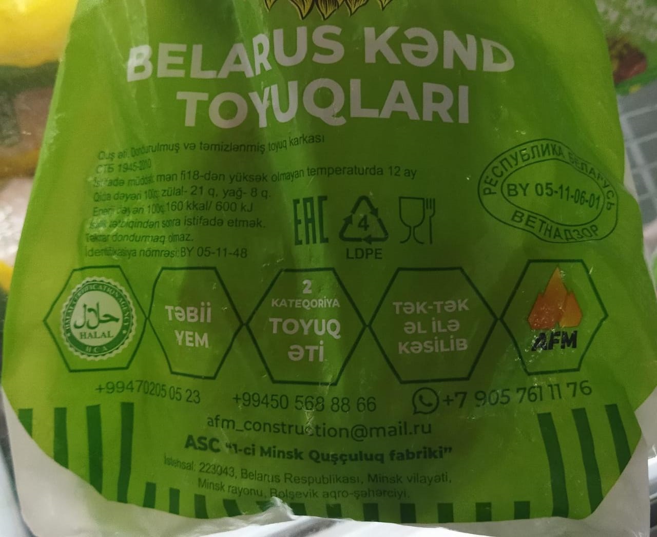 Azərbaycan Quş Əti, Yumurta İstehsalçıları və İxracatçıları Assosiasiyası bir daha bəyan edir ki, Belarusdan gətirilən və “Kənd toyuğu”, Halal toyuq adı altında sizə satılan toyuqlar qida dəyəri aşağı olan yumurtadan kəsilmiş ana toyuqlardır.