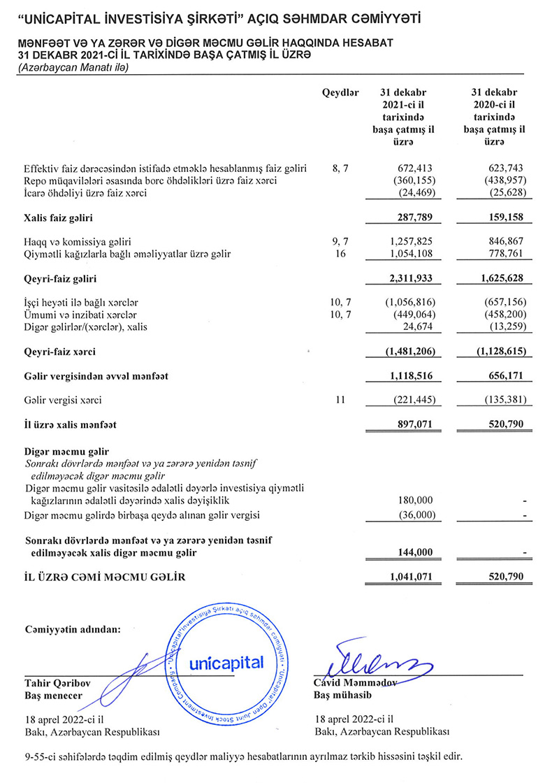 "Unicapital" 2021-ci ili 897 min maant xalis mənfəət ilə başa vurub. Halbuki, şirkət 2020-ci ili 521 min manat xalis mənfəət ilə bağlamışdı. Beləliklə, 2020-ci illə müqayisədə 2021-ci ildə "Unicapital"ın xalis mənfəəti 72% artıb.