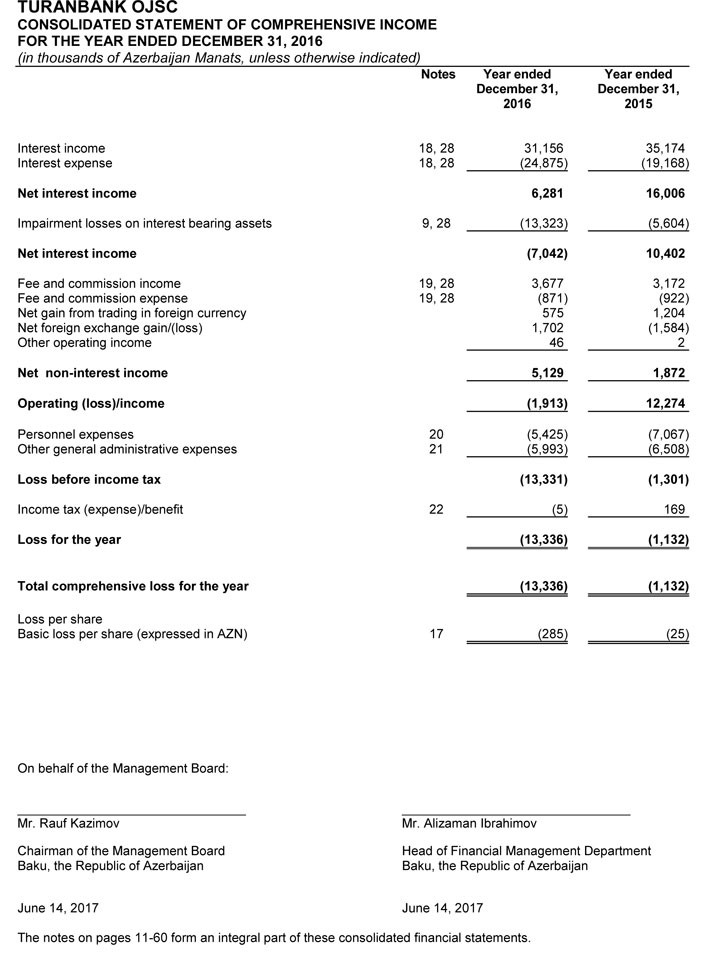 TuranBank 2016-cı il üzrə Audit hesabatını İnternet səhifəsində yerləşdirib. Hesabatdan məlum olur ki, Bank ötən il tarixinin ən böyük zərərlərindən birini edib.