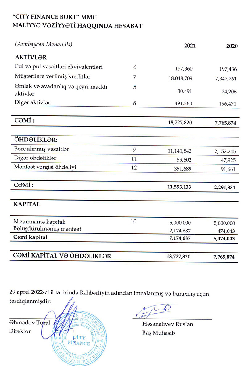 Lombard və avtomobil kreditlərinin verilməsilə məşğul olan "City Finance BOKT" MMC 2021-ci ili 1 milyon 701 min manat xalis mənfəət ilə başa vurub. Halbuki, təşkilat 2020-ci ili 417 min manat xalis mənfəət ilə bağlamışdı. Beləliklə, 2020-ci illə müqayisədə 2021-ci ildə "City Finance"ın xalis mənfəəti 4,1 dəfə artıb.