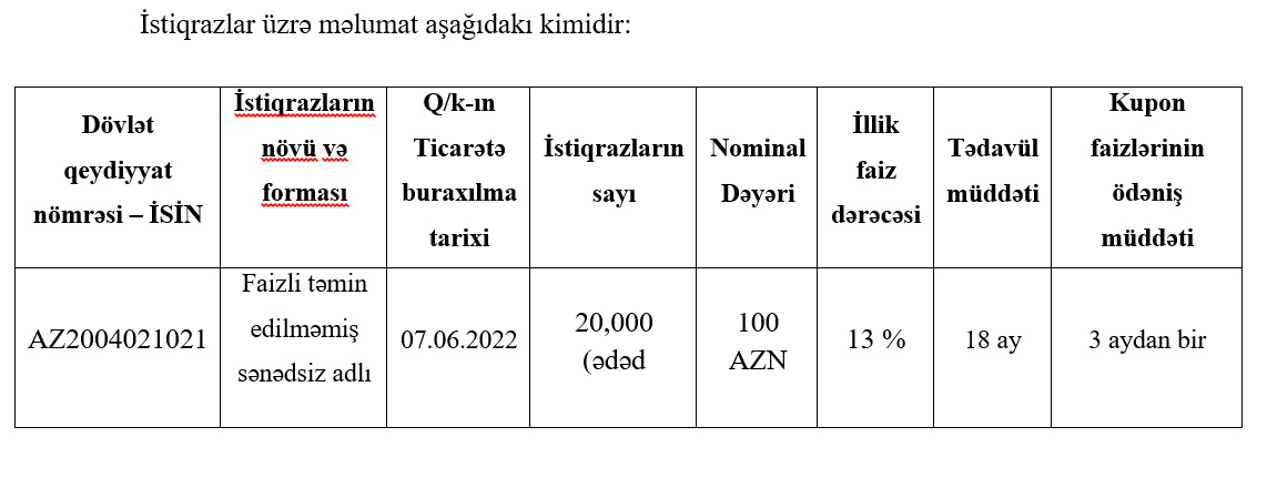 Faizli təmin edilməmiş sənədsiz adlı istiqrazların sayı 20 min ədəd, hər birinin nominal dəyəri 100 manat, illik faiz dərəcəsi (gəlirlilik) 13%, tədavül müddəti 18 ay, kupon faizlərinin ödəniş müddəti 3 aydan birdir.