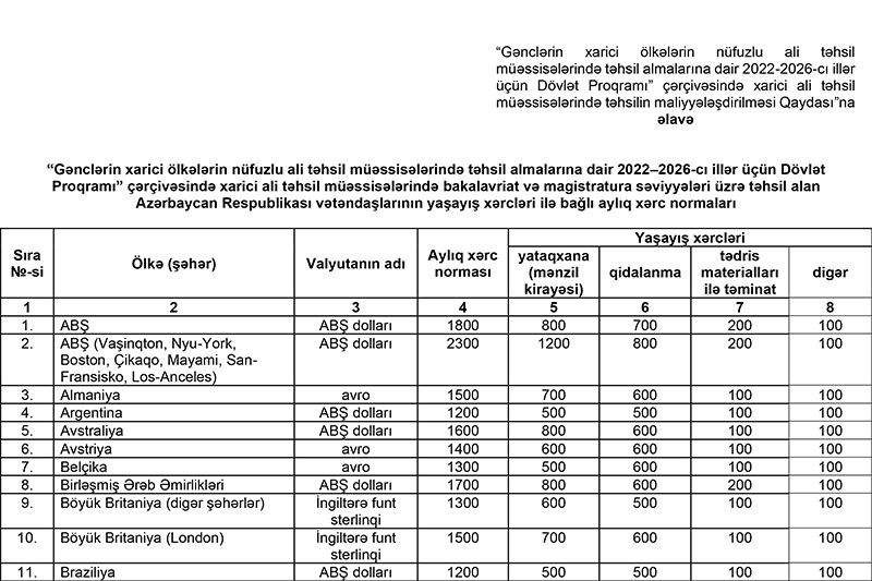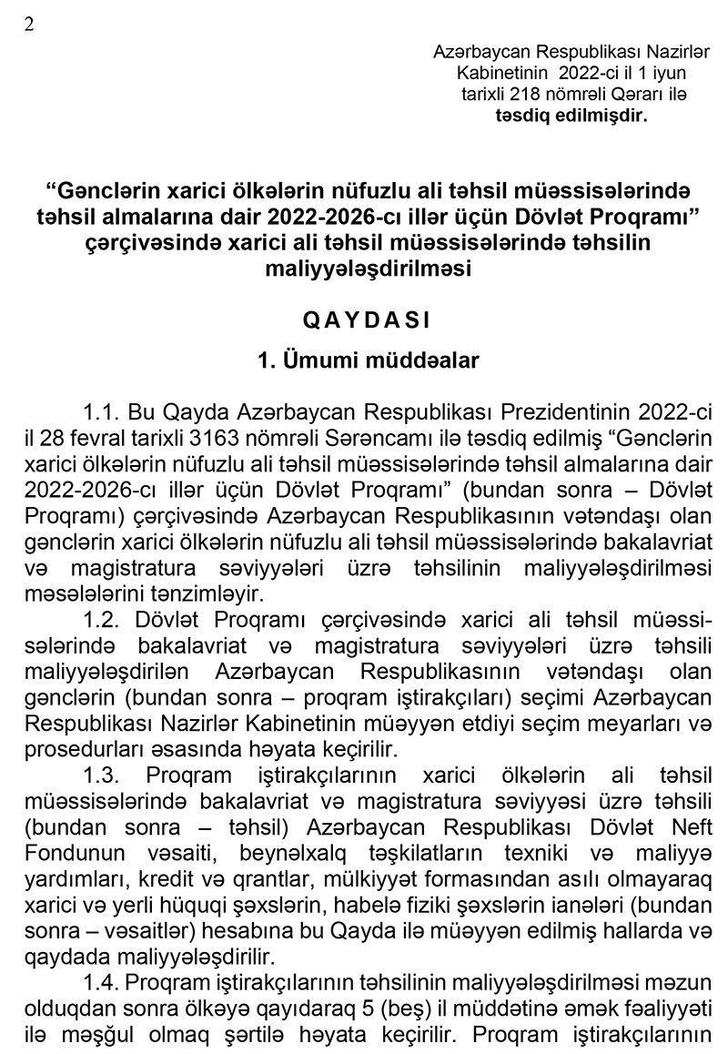 Bu Qərar da Prezidentin Sərəncamı ilə təsdiq olunmuş “Gənclərin xarici ölkələrin nüfuzlu ali təhsil müəssisələrində təhsil almalarına dair 2022–2026-cı illər üçün Dövlət Proqramı”nın həyata keçirilməsi üzrə Tədbirlər Planına əsasən qəbul edilib.