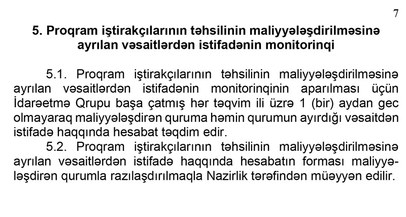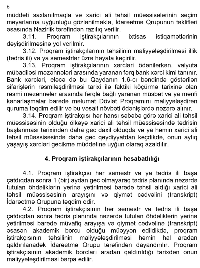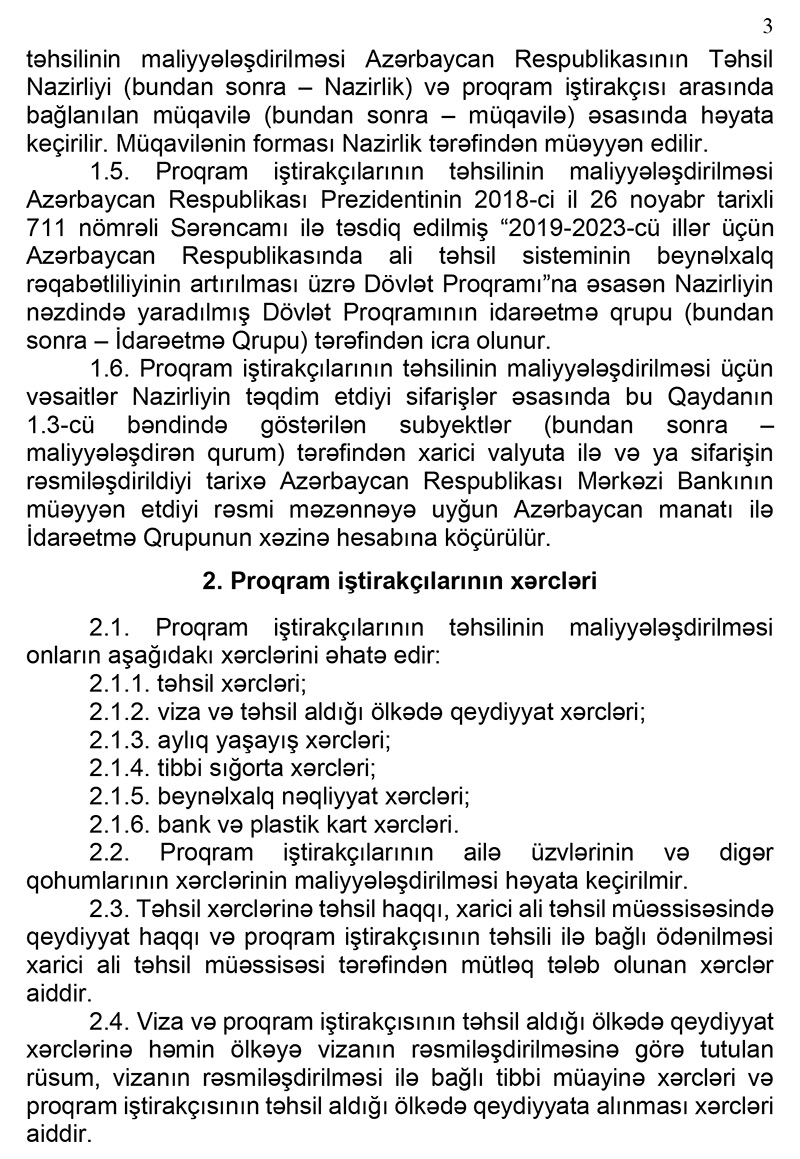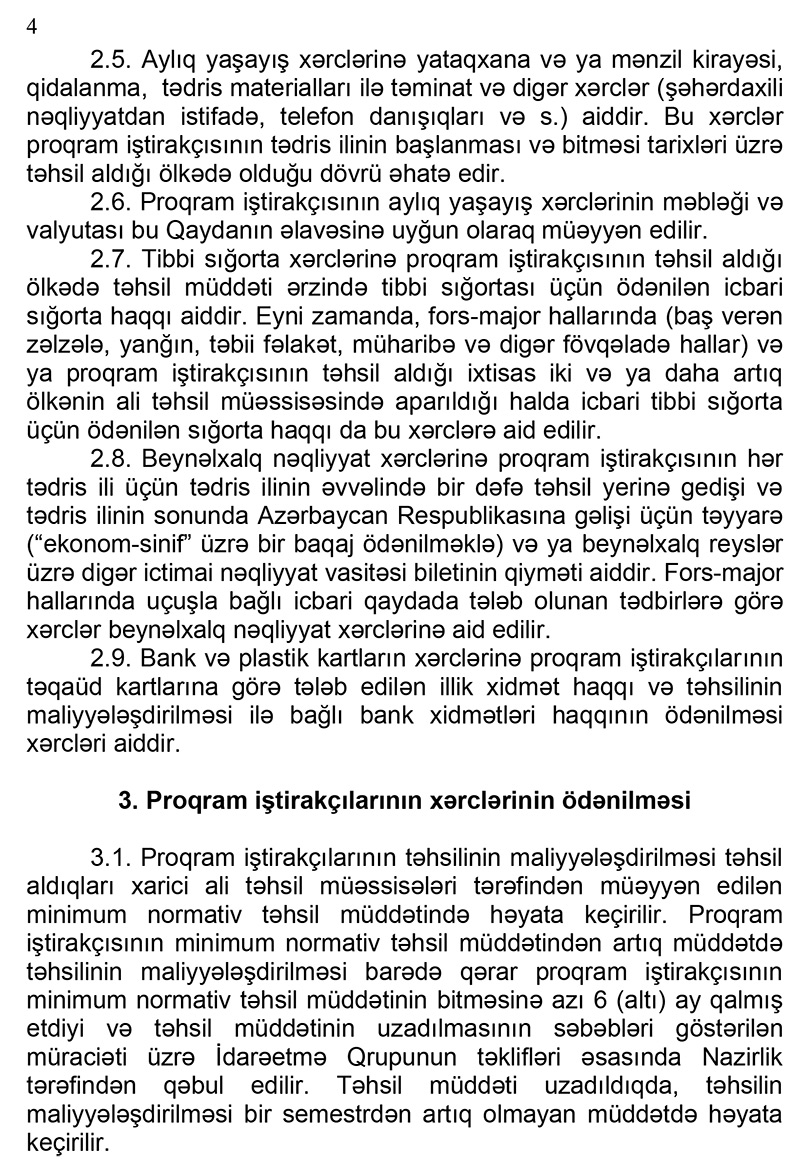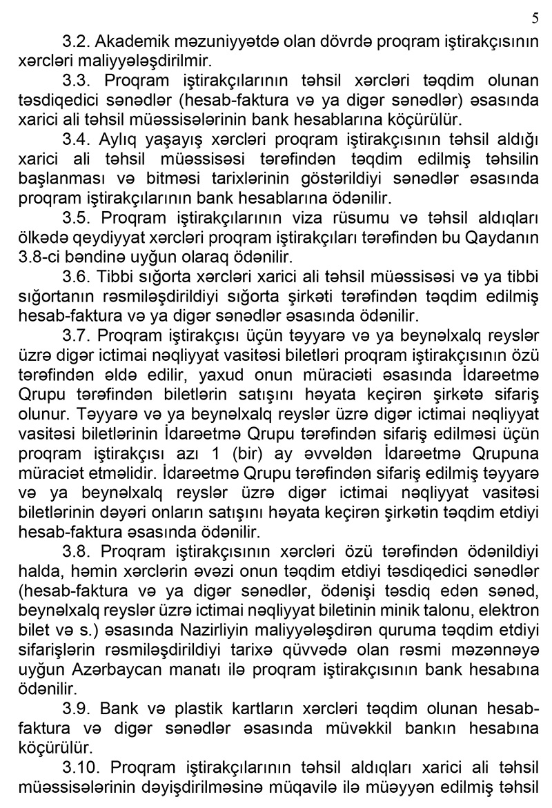 Qərar ilə təsdiq edilmiş Qaydada Dövlət Proqramı çərçivəsində xaricdə nüfuzlu ali təhsil müəssisələrində bakalavriat və magistratura səviyyələrində təhsil alacaq Azərbaycan Respublikası vətəndaşlarının təhsil, viza, qeydiyyat, aylıq yaşayış, tibbi sığorta, beynəlxalq nəqliyyat və digər xərclərinin qarşılanması nəzərdə tutulub.