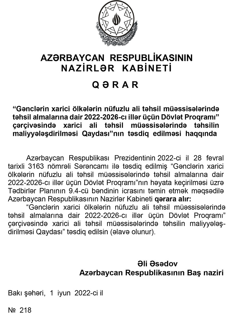 Həmçinin Nazirlər Kabinetinin digər qərarı ilə “Gənclərin xarici ölkələrin nüfuzlu ali təhsil müəssisələrində təhsil almalarına dair 2022–2026-cı illər üçün Dövlət Proqramı” çərçivəsində xarici ali təhsil müəssisələrində təhsilin maliyyələşdirilməsi Qaydası təsdiq edilib.
