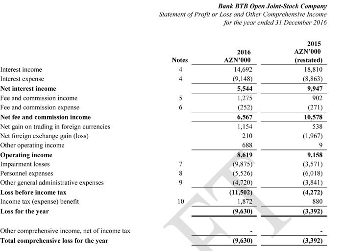 Hesabata görə, Bank BTB-nin 2015-ci ildə 3 milyon 392 min manat, 2016-cı ildə isə 9 milyon 630 min manat xalis zərəri olub. Son iki ildəki zərər 13 milyon manatı ötüb.