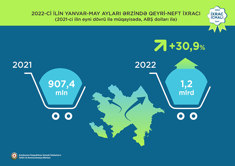 “İxrac icmalı”nın iyun sayına əsasən, 2022-ci ilin yanvar-may ayları ərzində Azərbaycanın ixracı 15,4 milyard ABŞ dolları, qeyri-neft sektoru üzrə 1,2 milyard ABŞ dolları təşkil edib. Qeyri-neft sektoru üzrə ixrac 2021-ci il ilə müqayisədə 280,6 milyon ABŞ dolları və ya 30,9% artıb.