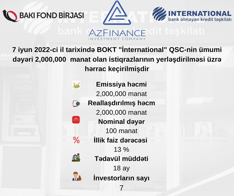7 iyun 2022-ci il tarixində Bakı Fond Birjasında BOKT "İnternational" QSC-nin tədavül müddəti 18 (on səkkiz) təqvim ayı olan AZ2004021021 dövlət qeydiyyat nömrəli, 2 milyon manat həcmində, faizli, təmin edilməmiş sənədsiz, adlı istiqrazlarının yerləşdirilməsi üzrə hərrac yekunlaşıb.