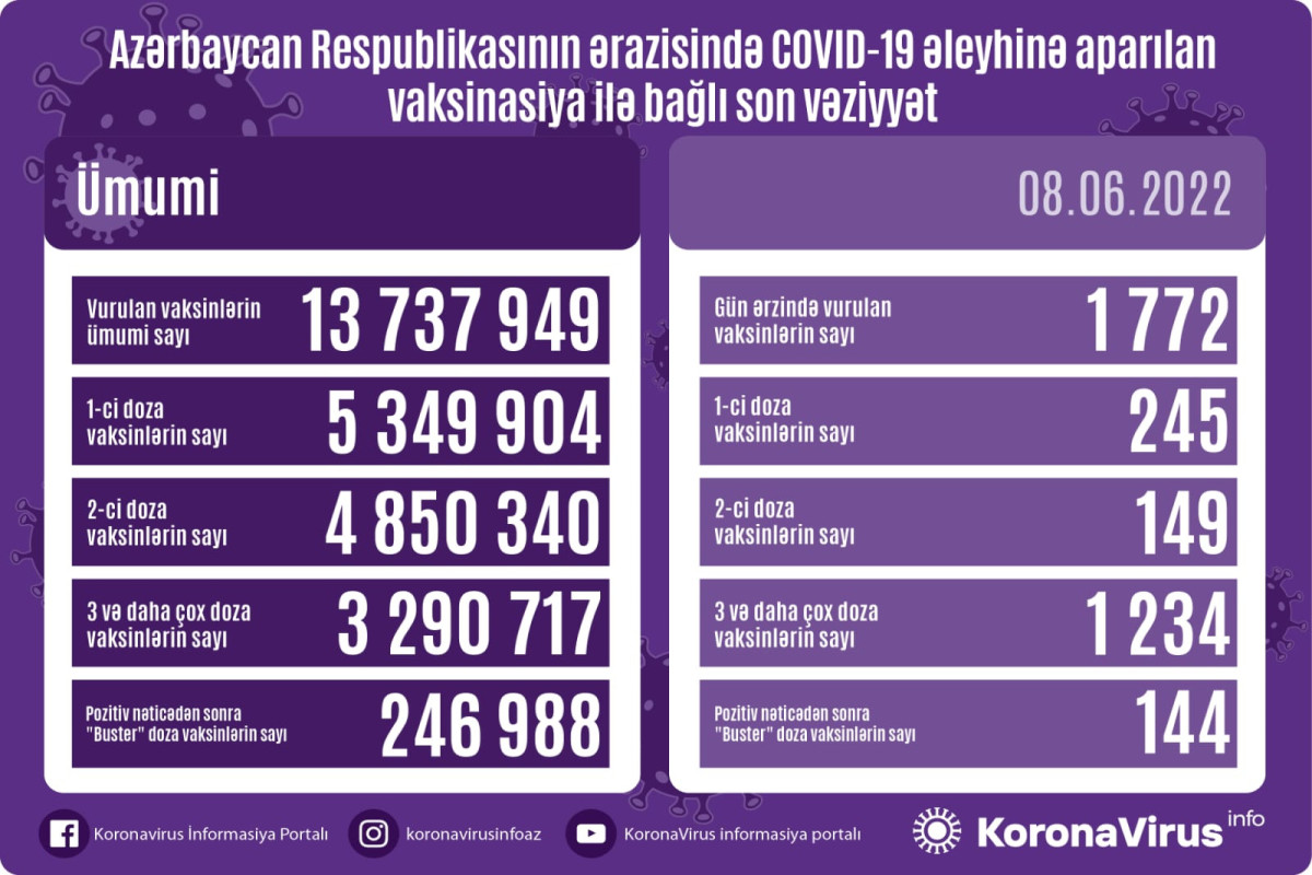 Azərbaycanda son sutkada koronavirus (COVID-19) əleyhinə 1772 vaksin vurulub.