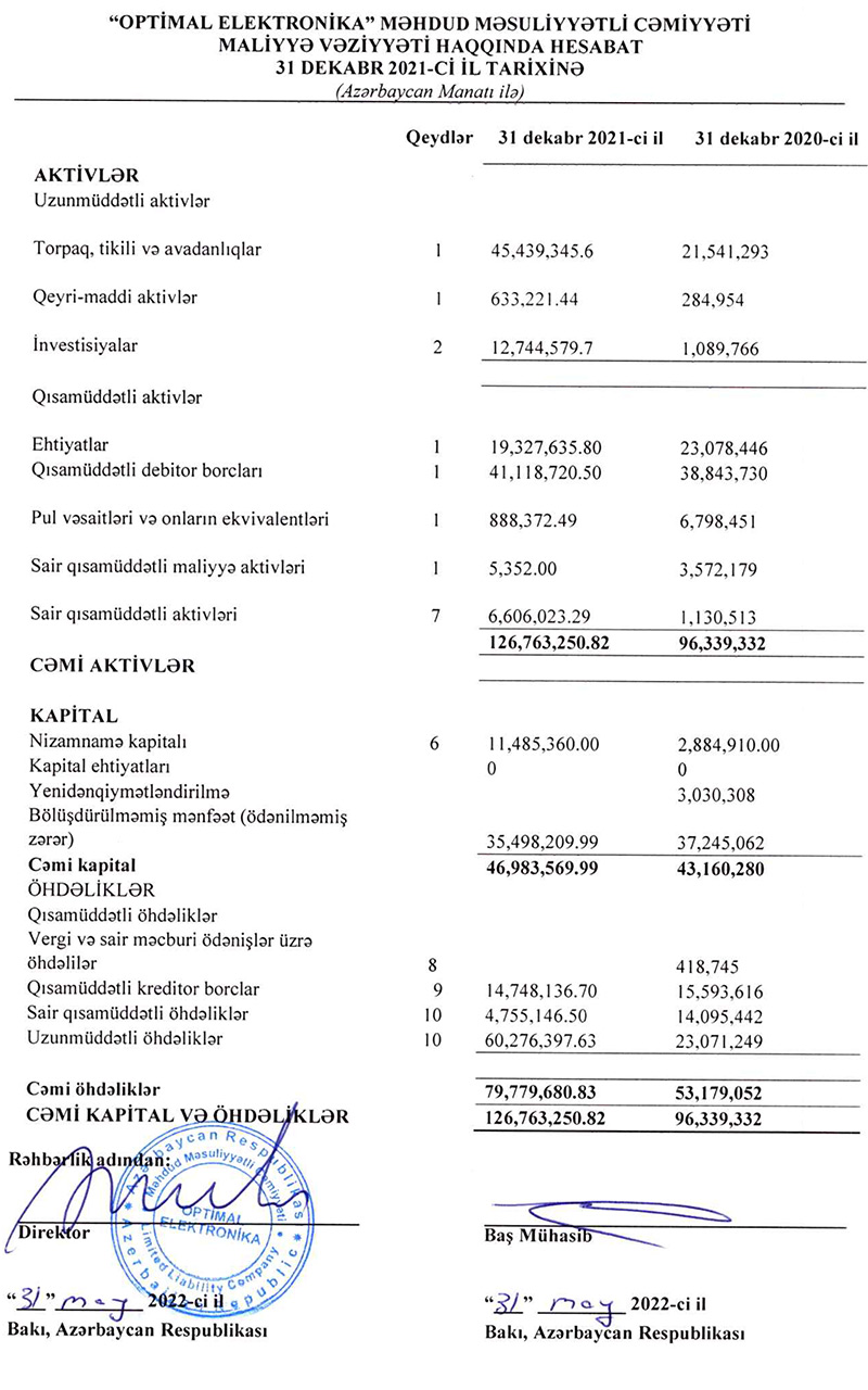 31 Dekabr 2021-ci il tarixində "Optimal Elektronika" MMC 126 milyon 763 min manat cəmi aktivlərə malik olub. Şirkət 2020-ci ilin sonunda 96 milyon 339 min manat cəmi aktivlərə malik idi.