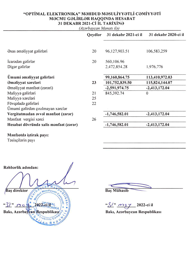 "Optimal Elektronika" MMC 2021-ci ili 1 milyon 747 min manat xalis zərər ilə başa vurub. Halbuki, şirkət 2020-ci ili 2 milyon 413 min manat xalis zərər ilə bağlamışdı. Beləliklə, 2020-ci illə müqayisədə 2021-ci ildə "Optimal Elektronika"nın xalis zərəri 666 min manat və ya 27,6% azalıb.