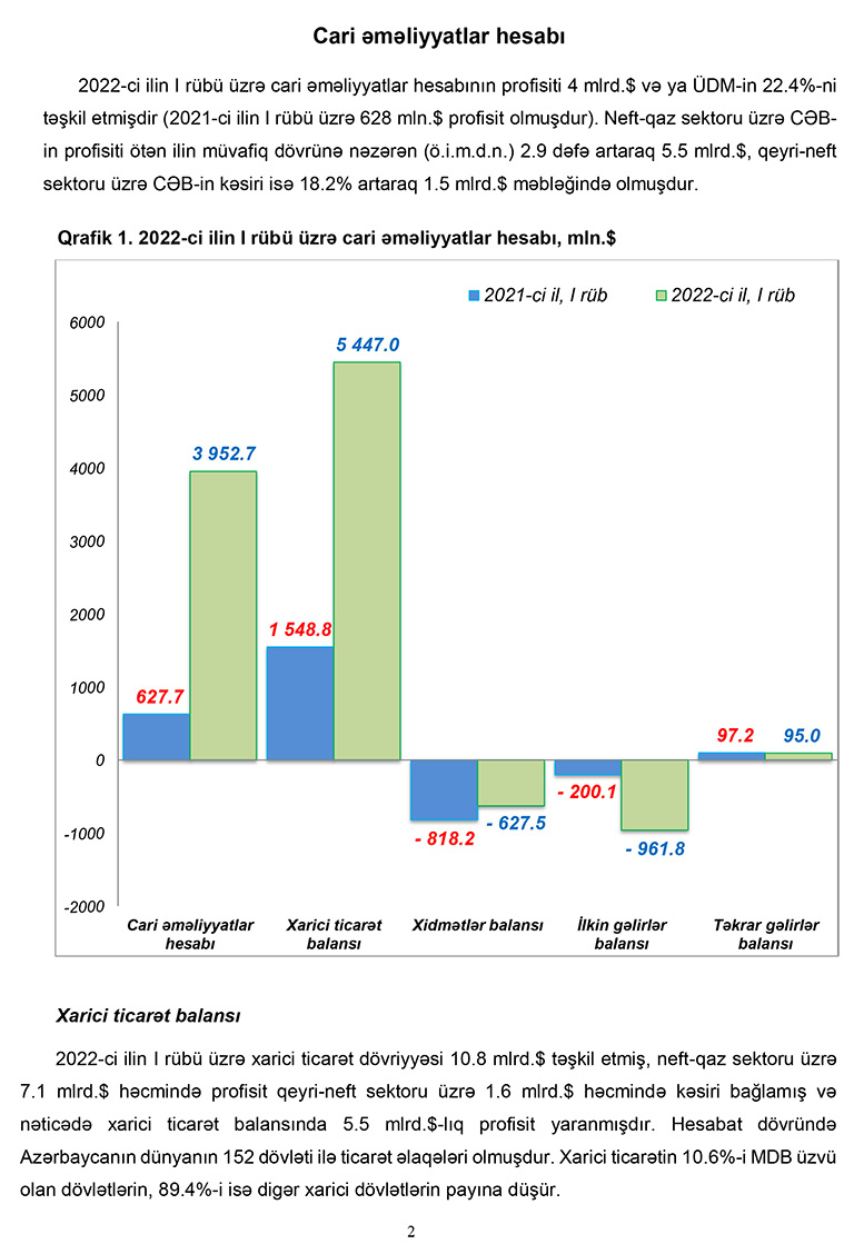 2022-ci ilin 1-ci rübü üzrə cari əməliyyatlar hesabının profisiti 4 milyard dollar və ya ÜDM-in 22.4%-ni təşkil etmişdir (2021-ci ilin 1-ci rübü üzrə 628 milyon dollar profisit olmuşdur). Neft-qaz sektoru üzrə CƏBin profisiti ötən ilin müvafiq dövrünə nəzərən (ö.i.m.d.n.) 2.9 dəfə artaraq 5.5 milyard dollar, qeyri-neft sektoru üzrə CƏB-in kəsiri isə 18.2% artaraq 1.5 milyard dollar məbləğində olmuşdur.
