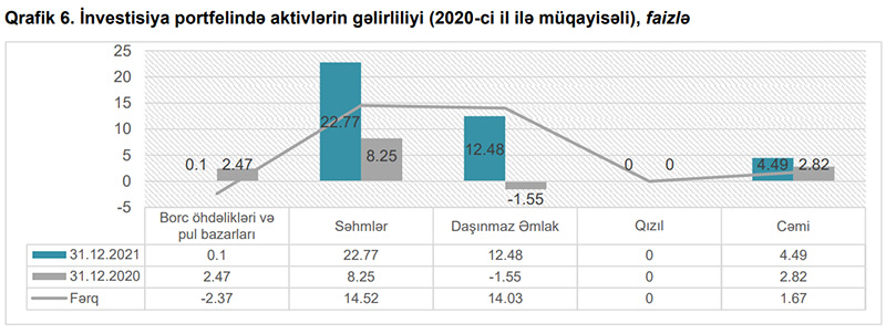 İnvestisiya portfelində aktivlərin gəlirliliyində 2020-ci ilə nisbətən artım daha çox səhmlər (8,25%-ə qarşı 22,77%) və daşınmaz əmlak alt portfeli üzrə (-1,55%-ə qarşı 12,48%) olmuş, borc öhdəlikləri və pul bazarları alt portfeli üzrə isə 2,37% azalma müşahidə edilmişdir