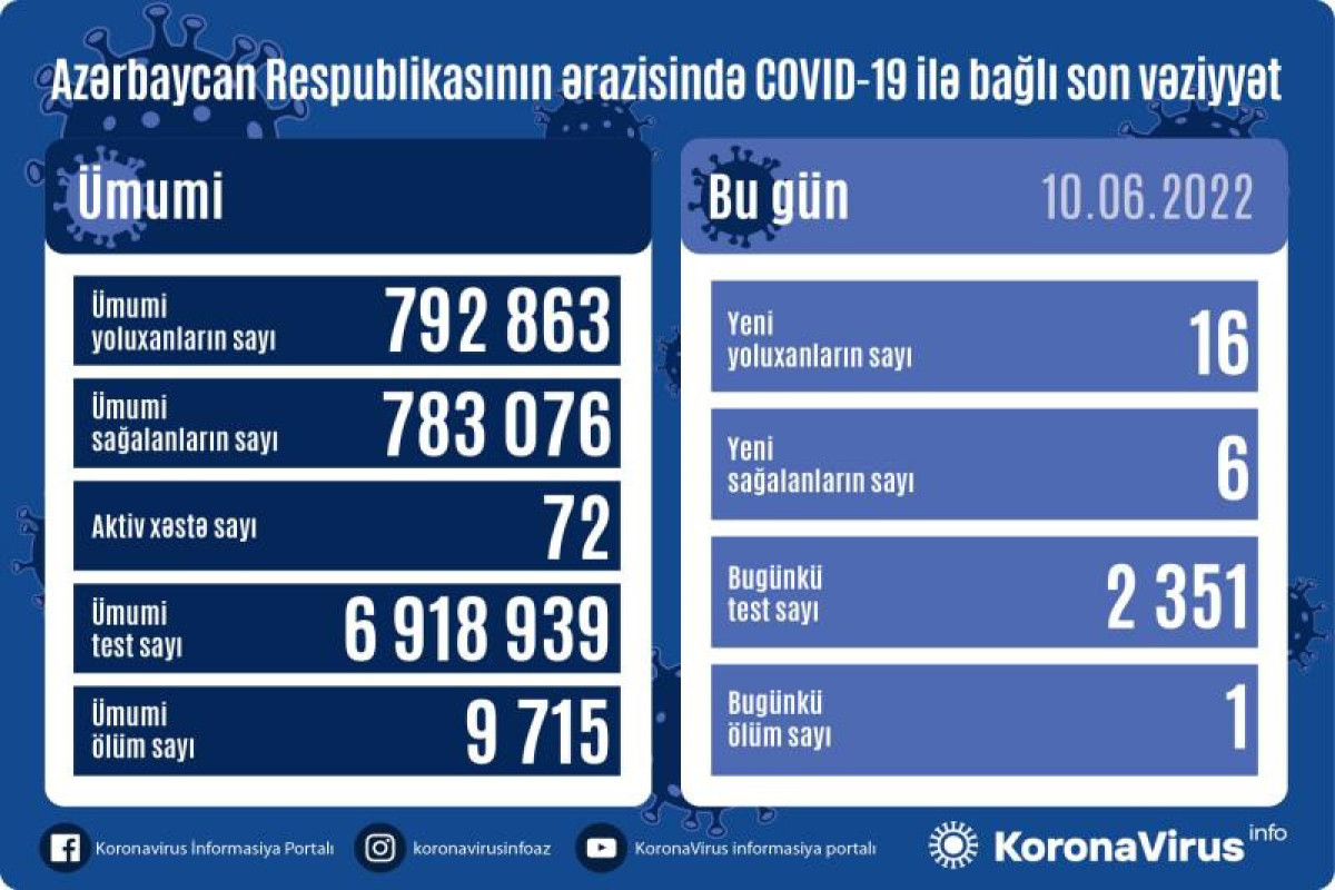 Azərbaycan Respublikasında koronavirus (COVID-19) infeksiyasına 16 yeni yoluxma faktı qeydə alınıb, 6 nəfər müalicə olunaraq sağalıb.