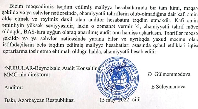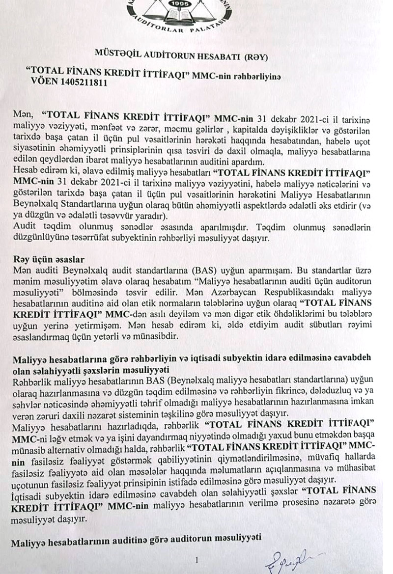 Total Finans Kredit İttifaqının 31 Dekabr 2021-ci tarixində bitən il üzrə maliyyə hesabatları