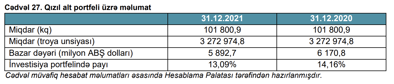 "Fondun investisiya portfelinin gəlirliliyi hesablanarkən qızıl alt portfeli nəzərə alınmamış, hesabat ilində qızıl alt portfelində dəyişiklik eyni dövrlə müqayisədə qiymətin azalması fonunda baş vermişdir ki, bu da Fondun büdcədənkənar xərclərində 472,8 milyon manat ekvivalentində özünü göstərmişdir", - Rəydə bildirilir.