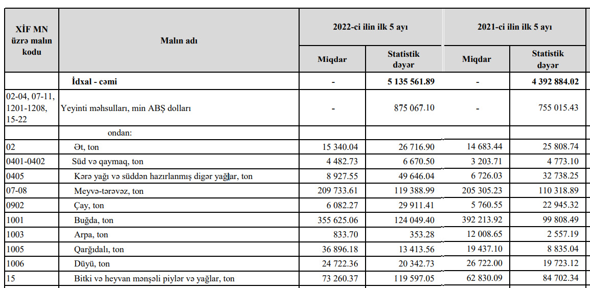 2022-ci ilin ilk 5 ayında Azərbaycana 875 milyon 67 min dollarlıq yeyinti məhsulları idxal edilib.