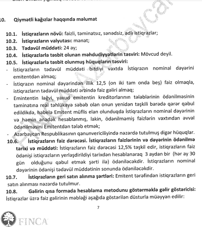 "Finca Azərbaycan" Qeyri Bank Kredit Təşkilatı MMM 10 milyon manatlıq istiqraz buraxır.