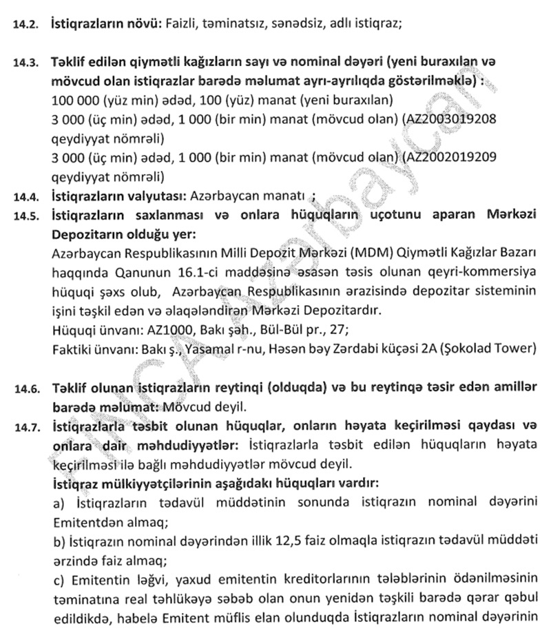 Marja.az xəbər verir ki, istiqrazların hər birinin nominal dəyəri 100 manat, sayı 100 min ədəd, faiz dərəcəsi 12,5%, tədavül müddəti 24 aydır.