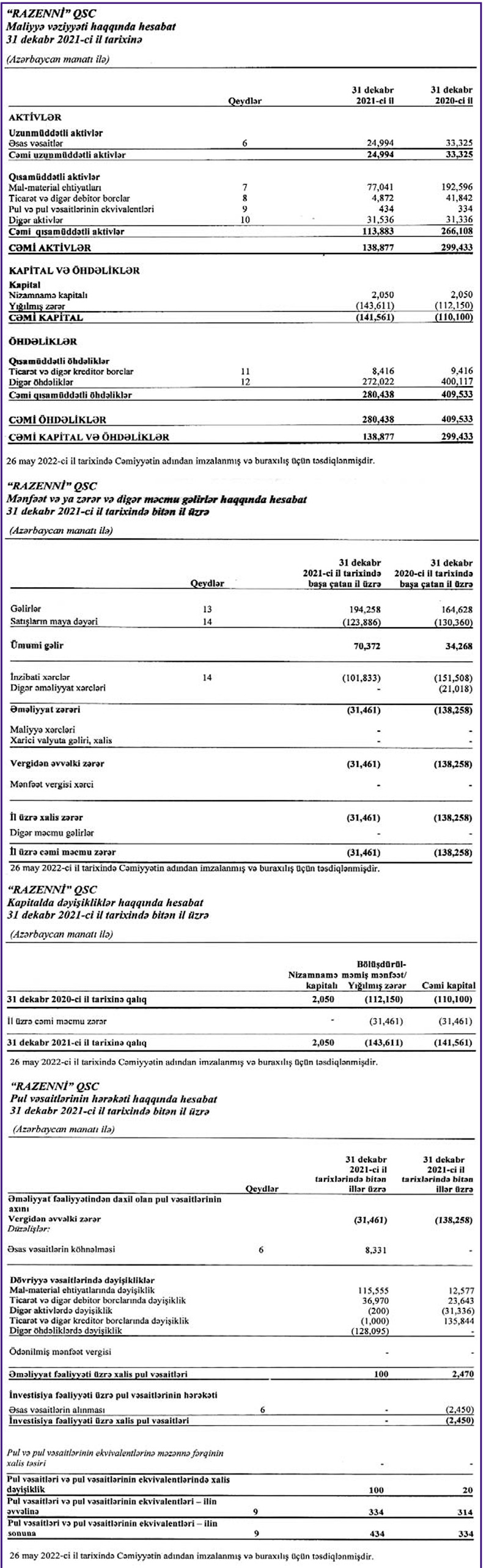 Marja xəbər verir ki, "Razenni" QSC 2021-ci ili 31 min manat xalis zərər ilə başa vurub. Şirkət 2020-ci ili 138 min manat xalis zərər ilə bağlamışdı. 2020-ci illə müqayisədə 2021-ci ildə "Razenni" QSC-nin gəlirləri 18% artaraq 194 min manat təşkil edib. 2020-ci ildə şirkətin gəlirləri 164 min manat olmuşdu.