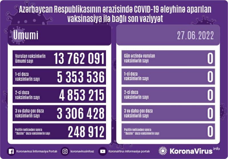 Azərbaycanda son sutkada koronavirus (COVID-19) əleyhinə 0 vaksin vurulub. Bir gündə birinci mərhələ üzrə vaksinasiya olunanların sayı 0, ikinci mərhələ üzrə vaksinasiya olunanların sayı 0, buster doza üzrə vaksinasiya olunanların sayı isə 0 nəfərdir.