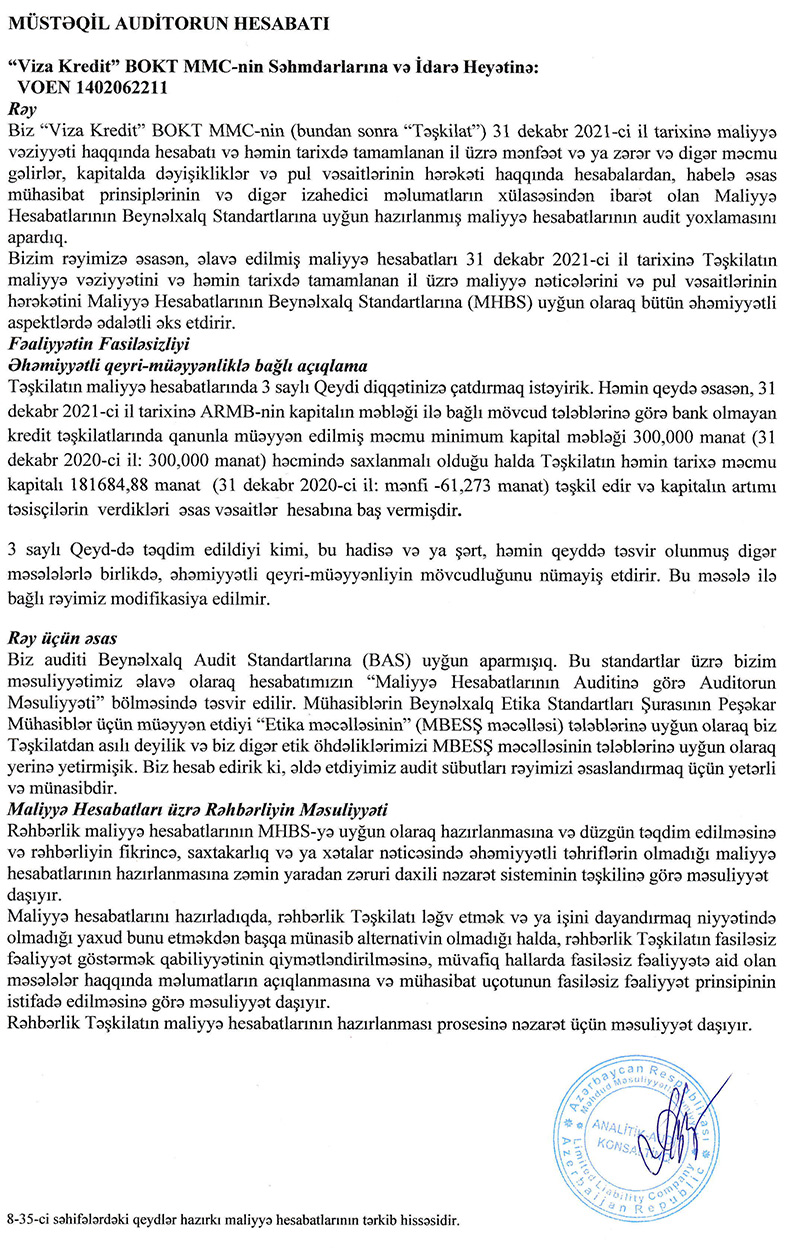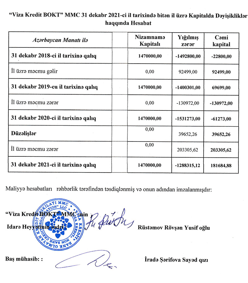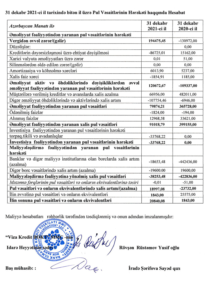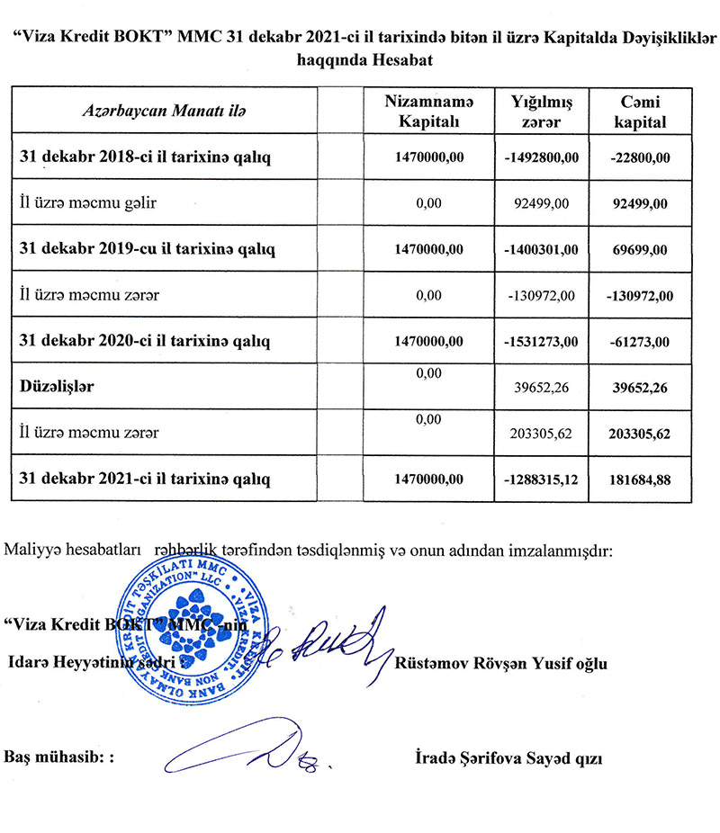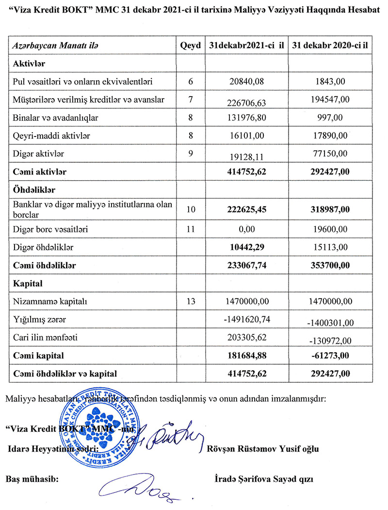 "Viza Kredit Bank Olmayan Kredit Təşkilatı" Məhdud Məsuliyyətli Cəmiyyəti 2021-ci il üzrə maliyyə göstəricilərini açıqlayıb.