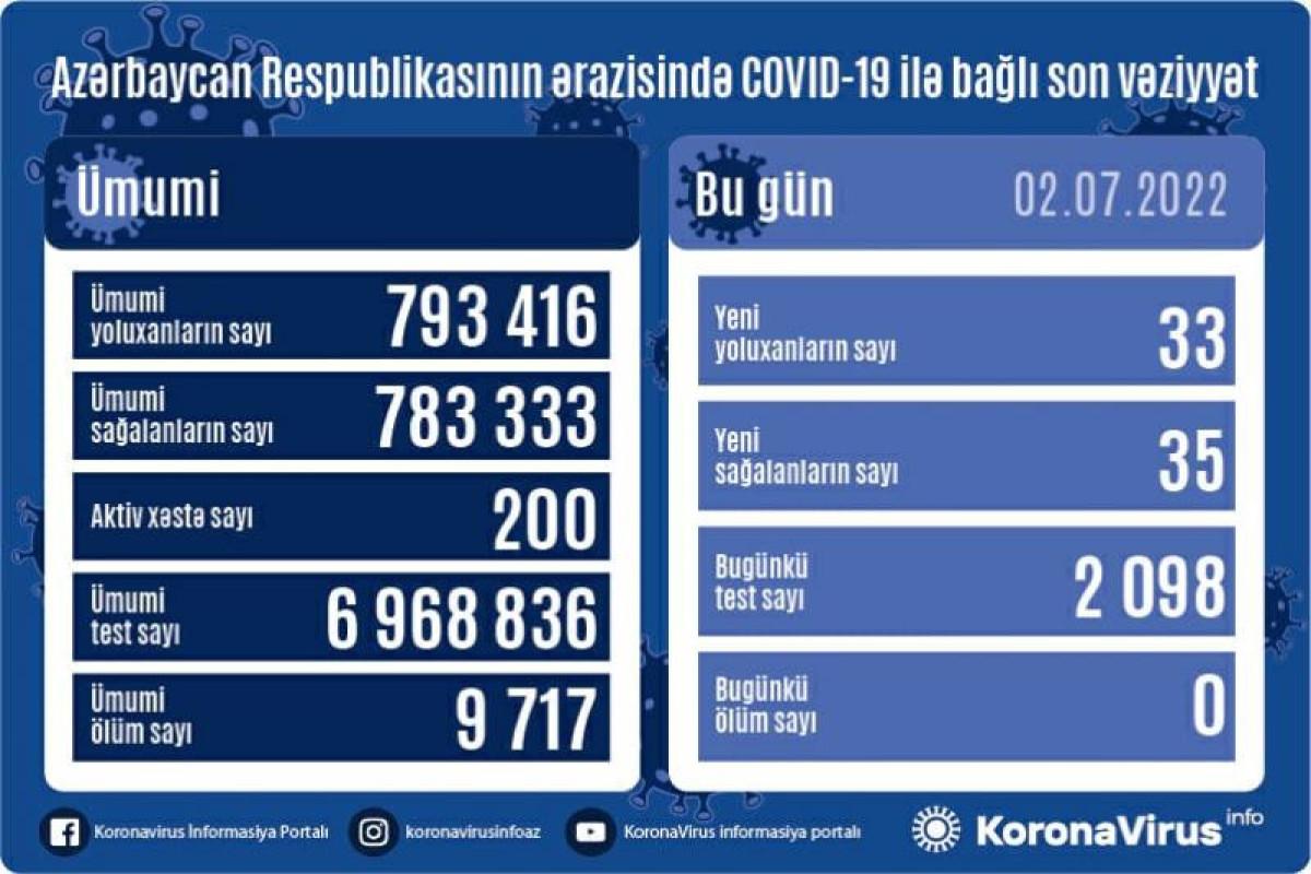 Azərbaycan Respublikasında koronavirus (COVID-19) infeksiyasına 33 yeni yoluxma faktı qeydə alınıb, 35 nəfər müalicə olunaraq sağalıb.