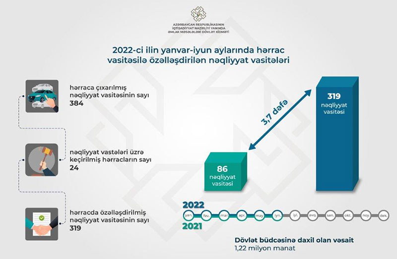 Xidmətin yaydığı məlumatda bildirilir ki, 2022-ci ilin birinci yarımilliyində nəqliyyat vasitələrinin satışa çıxarıldığı 24 hərrac keçirilib. Hərraclara çıxarılan 384 nəqliyyat vasitəsindən 319-u satılıb. Bu, ötən ilin eyni dövrü ilə müqayisədə 3,7 dəfə çoxdur. Nəqliyyat vasitələrinə olan sifarişlərin çoxluğu hərracları daha rəqabətli edib. Belə ki, 2022-ci ilin yanvar-iyun ayları ərzində nəqliyyat vasitələri üzrə ümumilikdə ilkin satış qiyməti 1 milyon 269 min 425 manat olsa da, rəqabətli hərrac nəticəsində bu, 1 milyon 620 milyon 911 manat təşkil edib. Başqa sözlə, təklif ilkin satış qiymətindən 351 min 486 manat çox olub.