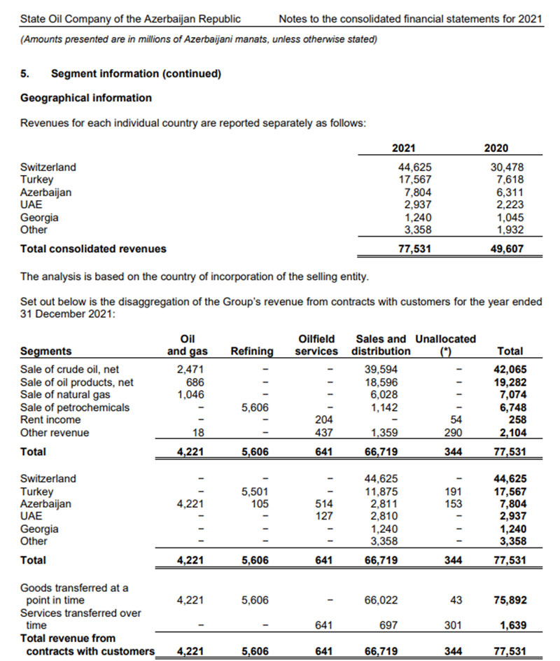 2021-ci ildə SOCAR Azərbaycandakı əməliyyatlardan 7 milyard 804 milyon manat (artım 23,7%), BƏƏ-dəki əməliyyatlardan 2 milyard 937 milyon manat (artım 32,1%), Gürcüstandakı əməliyyatlardan 1 milyard 240 milyon manat (artım 18,7%), digər ölkələrdəki əməliyyatlardan isə 3 milyard 358 milyon manat (artım 1,7 dəfə) gəlir əldə edib.