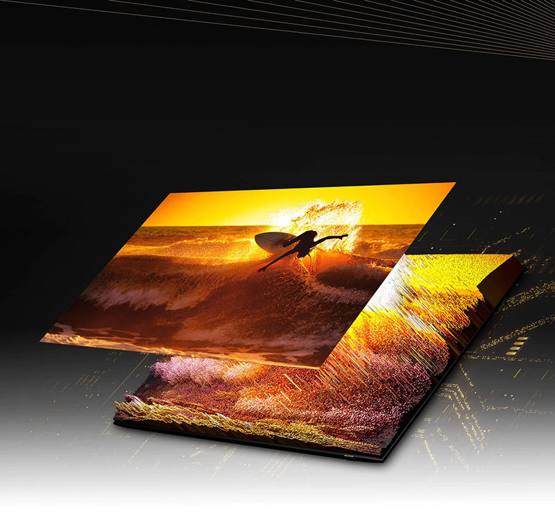 Buna misal olaraq, Quantum Mini LED-lər sayəsində ultra dolğun qara rəngin ötürülməsi və parlaq arxa işıqlandırma təmin edilir. Xırda kvant nöqtələri ən parlaq səhnələrdə belə 100% rəng həcmini təqdim edir. Özünü işıqlandıran LED texnologiyası və Quantum HDR dəstəyi sayəsində displeyin işıqlandırılması tam olaraq idarə olunur və bu səbəbdən maraqlı film izləməyinizdən və ya oyun konsolunda oynamanızdan asılı olmayaraq ekranda baş verənlərin ab-havasına qərq olursunuz.