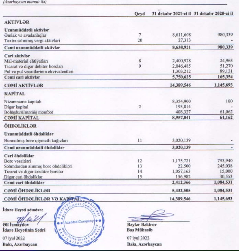 Qeyd edək ki, “AzeSteelCompany”nin cəmi kapitalının kəskin artması ötən il şirkətin nizamnamə kapitalını 100 manatdan 8 milyon 354 min manata qədər artırması ilə bağlıdır. Bundan əlavə, şirkətin böyüməsi onun cəmi aktiv və öhdəliklərini də kəskin artırıb.