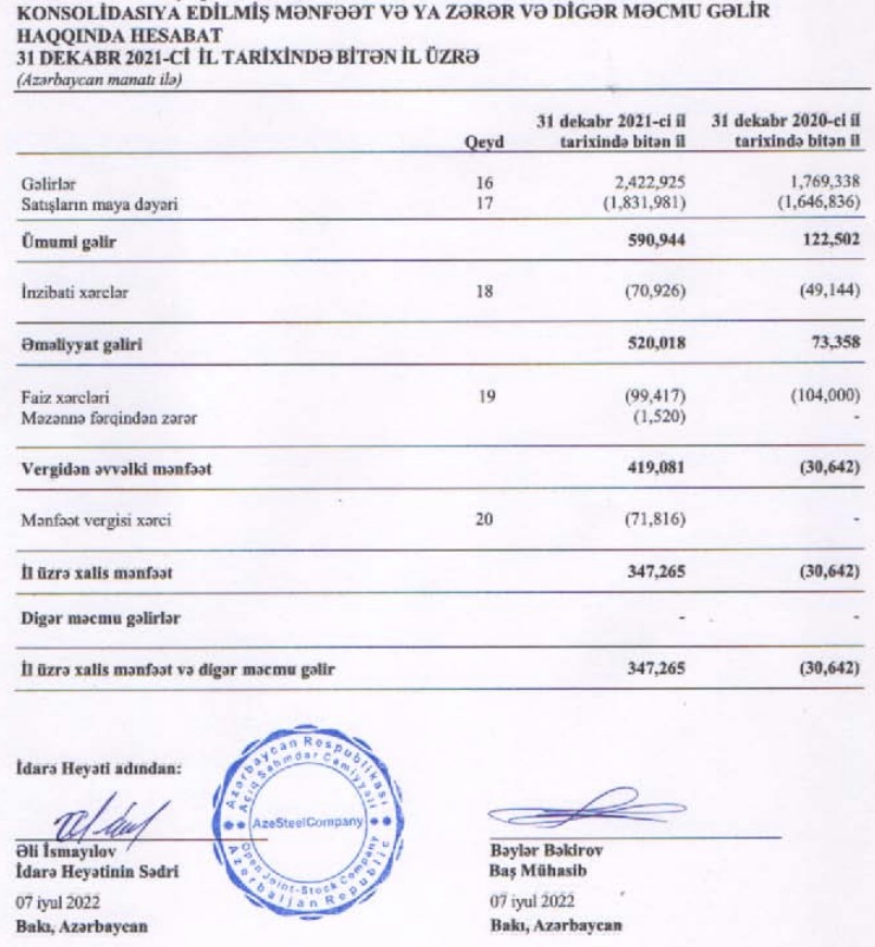 Marja xəbər verir ki, Şirkət 2021-ci ili 347,3 min manat xalis mənfəətlə başa vurub. Qeyd edək ki, “AzeSteelCompany” 2020-ci ili 30,6 min manat xalis zərər ilə bağlamışdı.