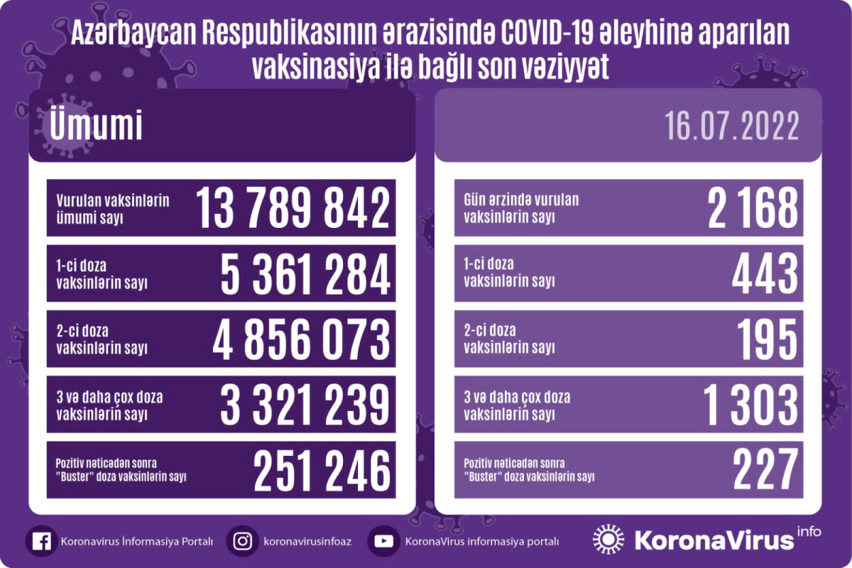 Azərbaycanda son sutkada koronavirus (COVID-19) əleyhinə 2168 vaksin vurulub. Bir gündə birinci mərhələ üzrə vaksinasiya olunanların sayı 443, ikinci mərhələ üzrə vaksinasiya olunanların sayı 195, üç və daha çox doza üzrə vaksinasiya olunanların sayı 1303, pozitiv nəticədən sonra buster doza üzrə vaksinasiya olunanların sayı 227 nəfərdir.